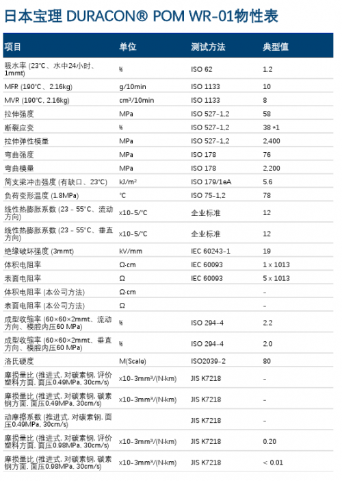 POM WR-01是日本宝理塑料公司(Polyplastics) 生产的一种耐候(Weather Resistant)型聚甲醛(POM)共聚物。POM: 聚甲醛,基础材料。WR: 代表 Weather Resistant(耐候性)。这是关键标识。01: 通常代表该系列中的基础或标准牌号。